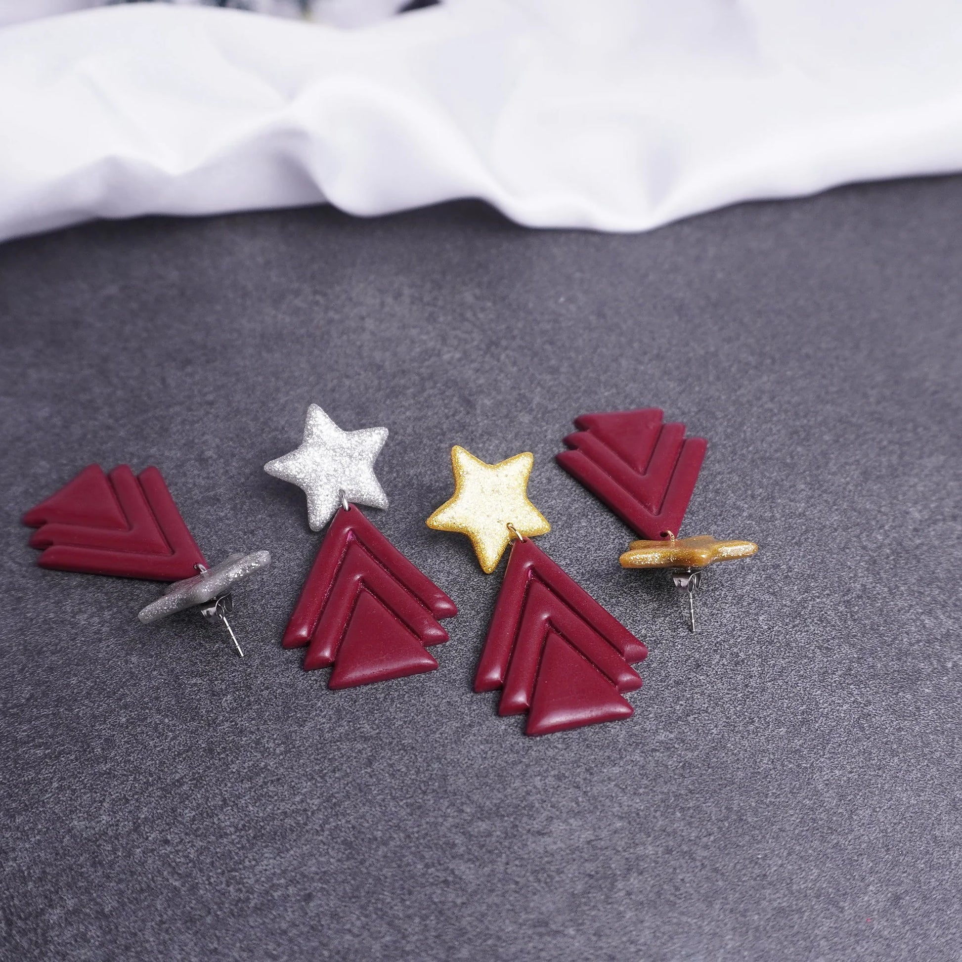 Sternförmige Ohrringe mit Tannenbaum in Gold, Silber, und Bordeaux – aus der Kollektion „X-Mas“ – geschaffen, um die grauen Tage etwas bunter zu machen.
